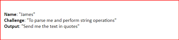 If we have the starting index for “James” which is the index of “ character (quote) and index of Challenge: keyword from the whole string, and returns the text in between these two indices, we will get our first string “James”.