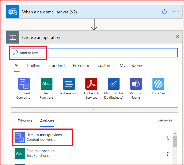 Search for ‘html to text’ in the search connectors and trigger searchbox. From the list of available actions, select Html to text (preview).