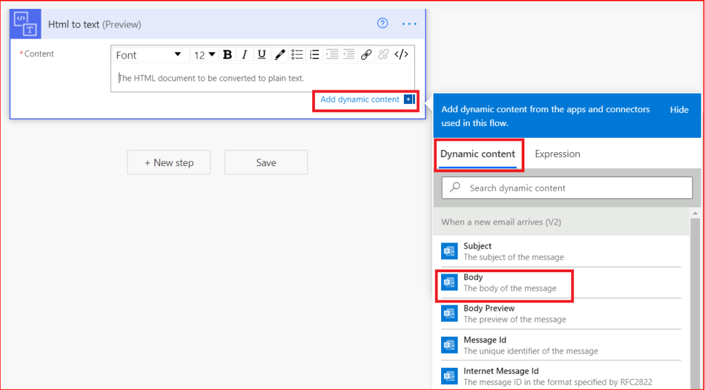 Now click on Add dynamic content -> Dynamic Content -> Body.