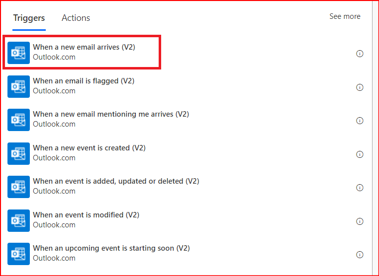 I will use the below trigger from Outlook.com connector for this demo as I am using my Microsoft account and not a work account.