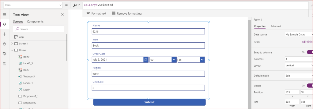 Now that I have the form ready to display the selected record from the gallery, let’s add code to make this happen.