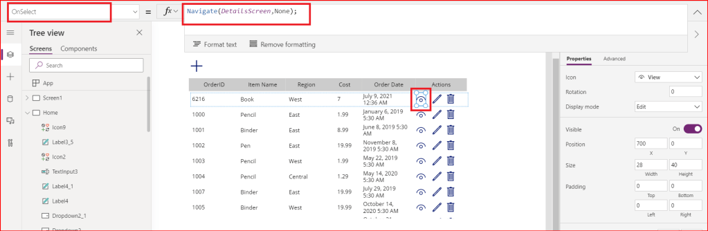 With this, when we click on View icon in any row inside the gallery, it will take us to the DetailsScreen and display the record which we have selected.