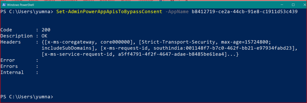 Set-AdminPowerAppApisToBypassConsent -AppName b8412719-ce2a-44cb-91e8-c1911d53c439