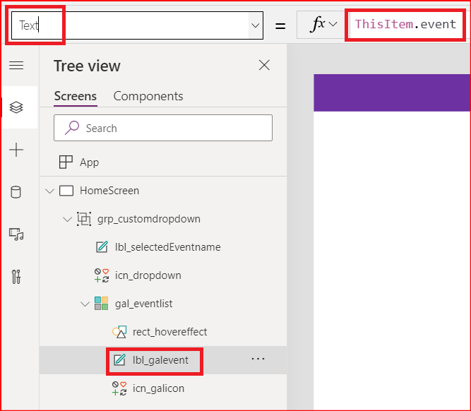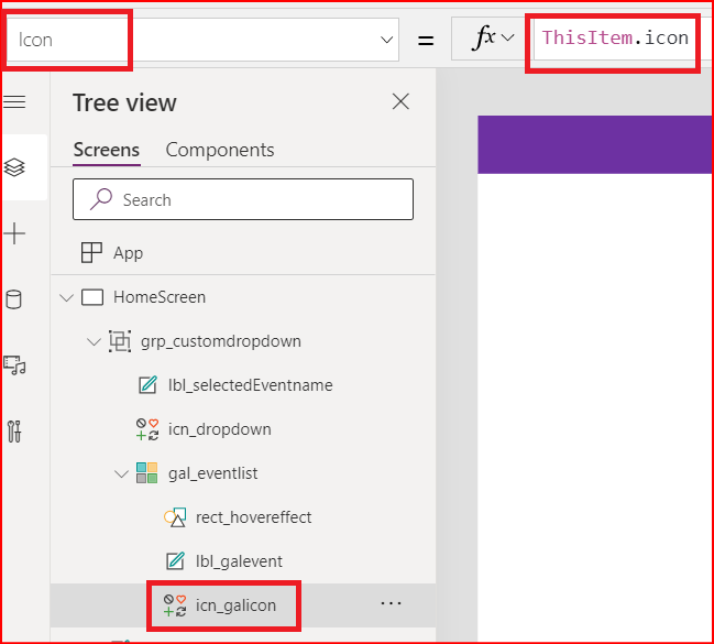 Step 6. Set the Icon property of the icon control icn_galicon to ThisItem.icon. Also set the Text property of the label lbl_galevent to ThisItem.Event.