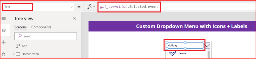 Step 9. Add the below code to the Text property of control lbl_selectedEventname so that whenever an item is selected from the dropdown gallery, it is shown in the label control.
